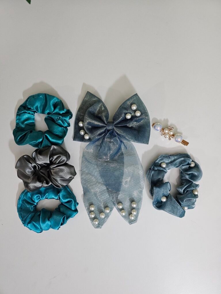 This cute hair accessories combo set includes a stylish satin bow clip and soft fabric scrunchies. Designed to be gentle on hair and comfortable to wear, it is perfect for everyday use, parties, and special occasions.
