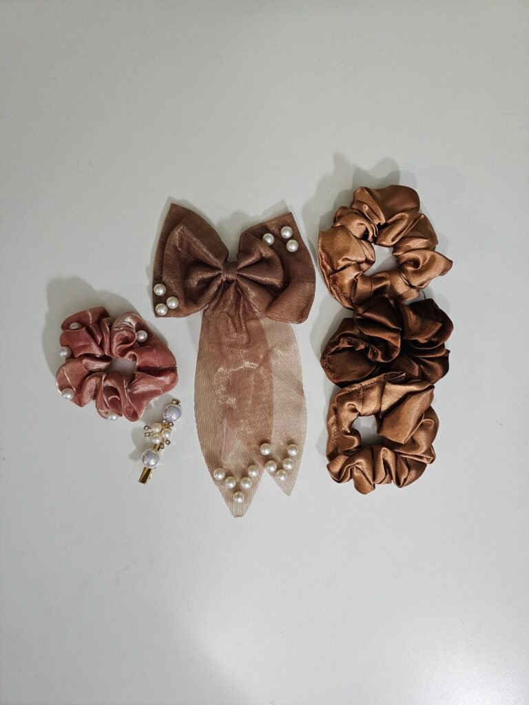 This cute hair accessories combo set includes a stylish satin bow clip and soft fabric scrunchies. Designed to be gentle on hair and comfortable to wear, it is perfect for everyday use, parties, and special occasions.