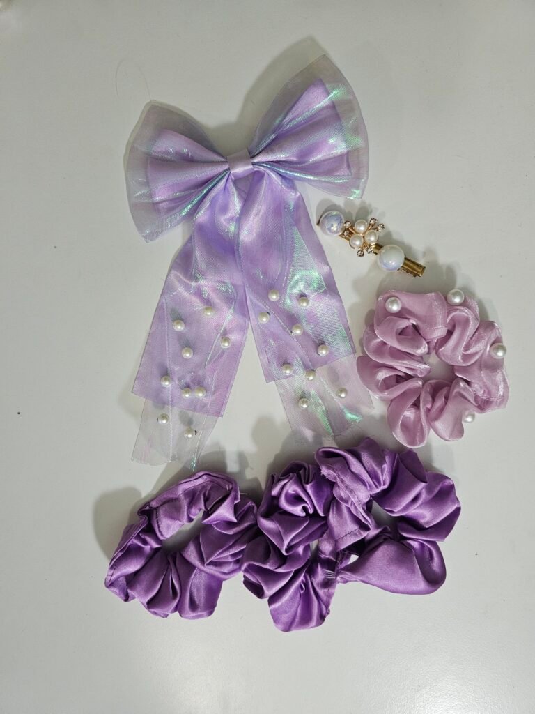 This cute hair accessories combo set includes a stylish satin bow clip and soft fabric scrunchies. Designed to be gentle on hair and comfortable to wear, it is perfect for everyday use, parties, and special occasions.